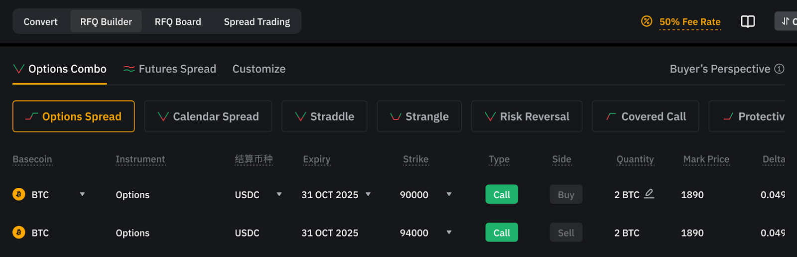 — 在已成交标签页项下,点击 RFQ 平仓,即可创建与当前持仓方向相反、数量相同的多腿 RFQ;您也可以点击 再次发送,再次发送相同的 RFQ。