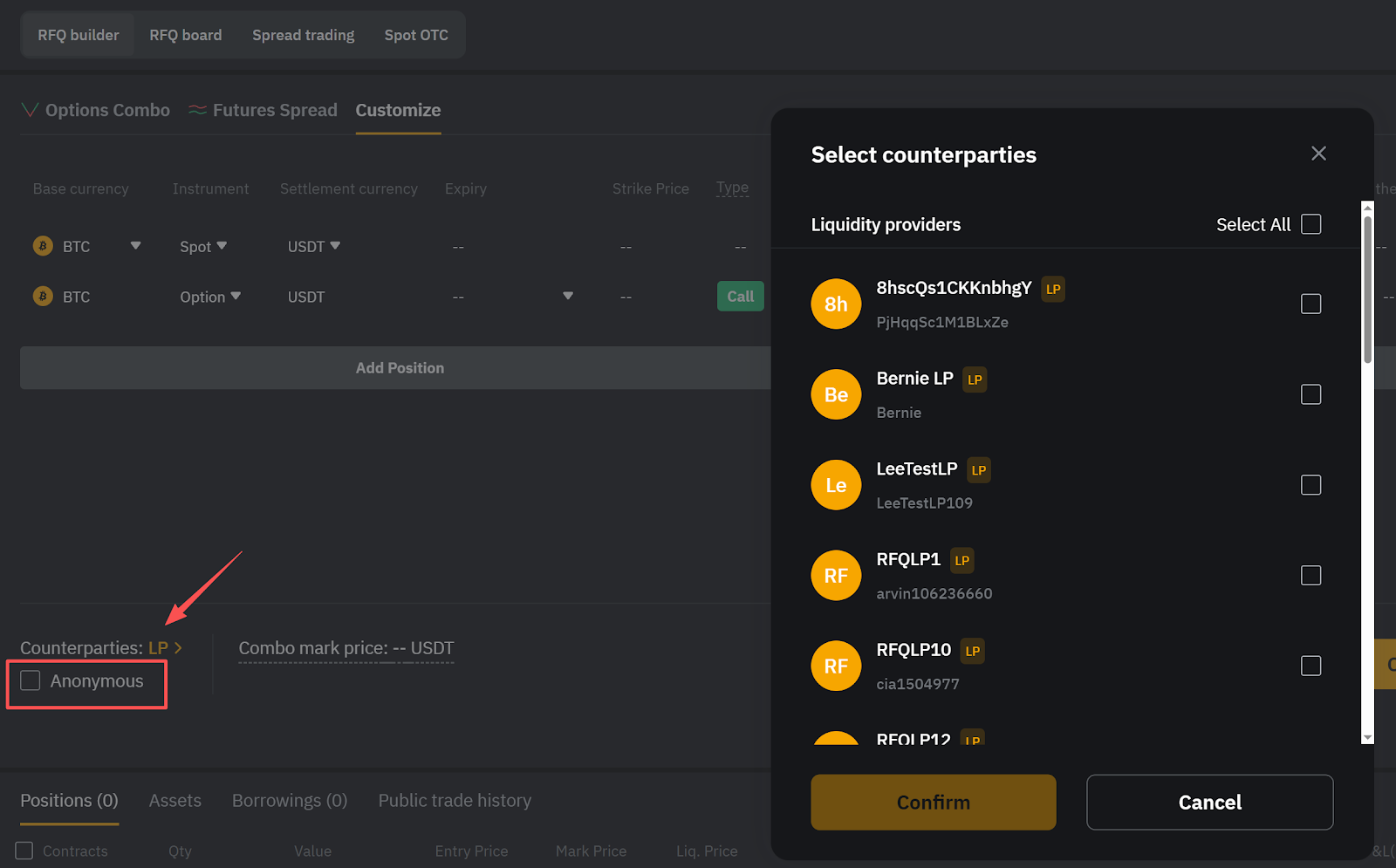 第 6 步:完成策略设置后,点击左下方的 LP,选择一个或多个交易对手。如需充分保障交易私密性,可勾选匿名选项。