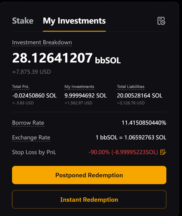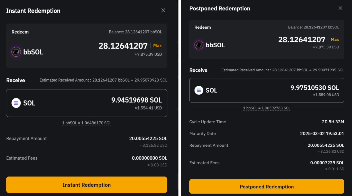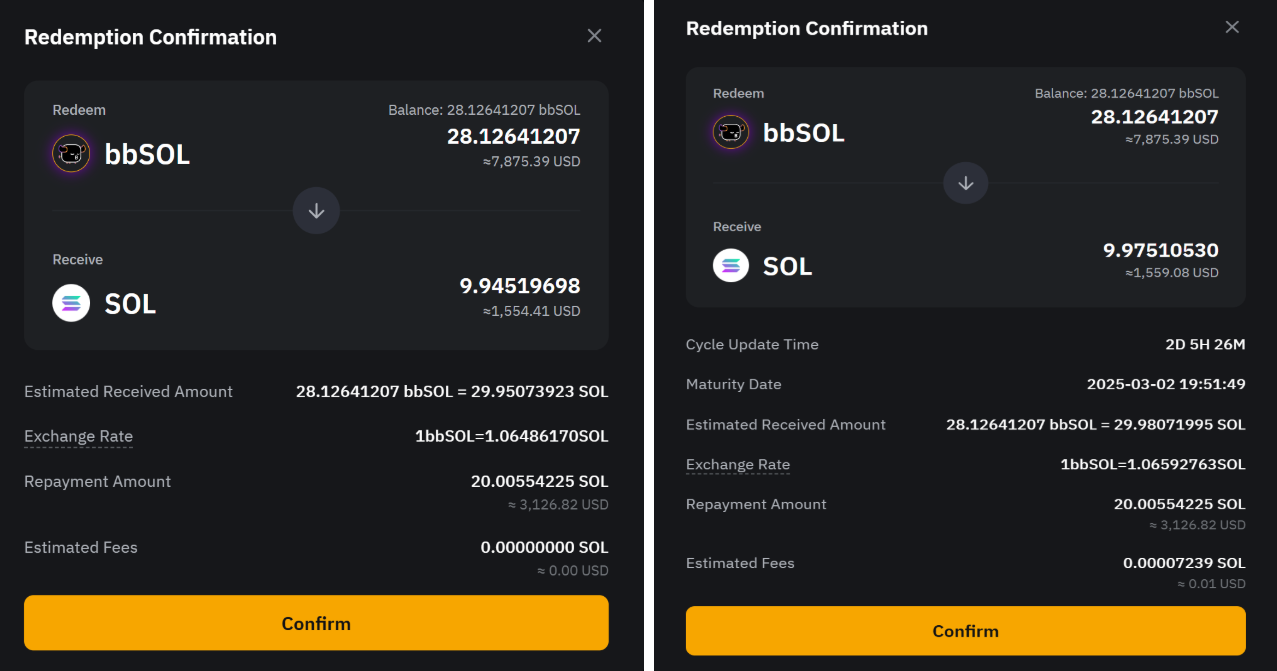 延时赎回:所有本金与收益将会在 1 - 4 天后到账,期间收益会继续累加。 当您提交赎回申请时,您的 bbSOL 将按实时汇率兑换为 SOL。