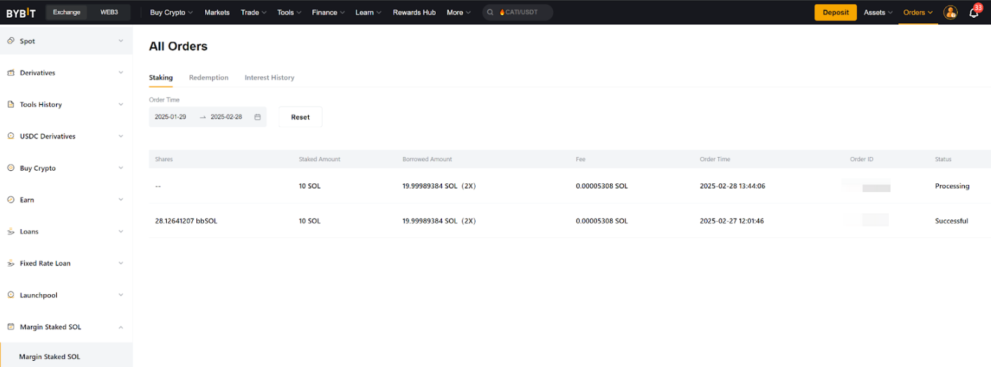 第 2 步:在杠杆质押 SOL 订单页面中,您还可点击质押、赎回和利息记录,查看更多详情。