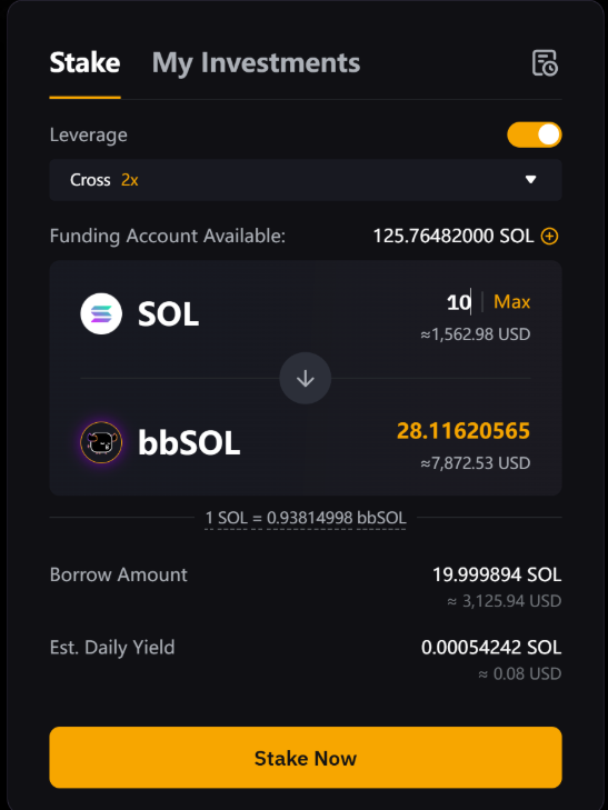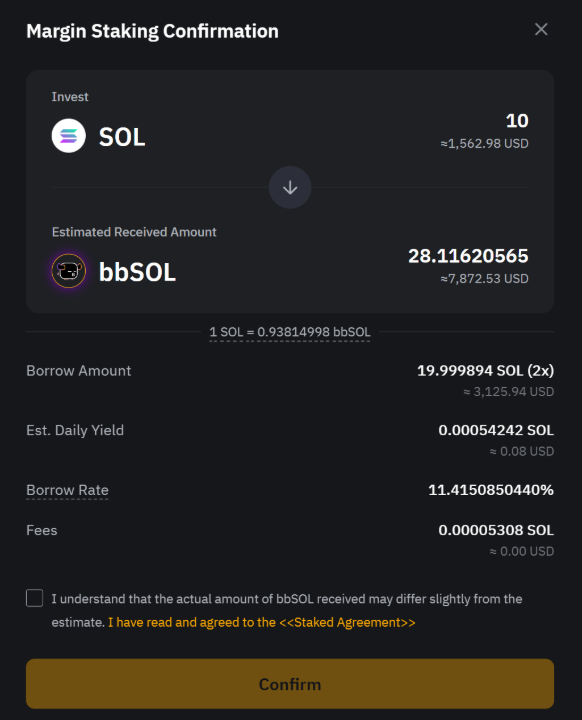 您预期可获得的 bbSOL 金额,根据您的杠杆率、质押的 SOL 金额以及 SOL 与 bbSOL 之间的实时汇率计算得出。 |