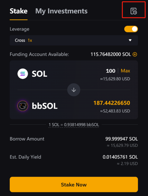 第 1 步:如需查看订单,请点击杠杆质押 SOL 主页中质押或我的投资面板右上角的历史记录图标。