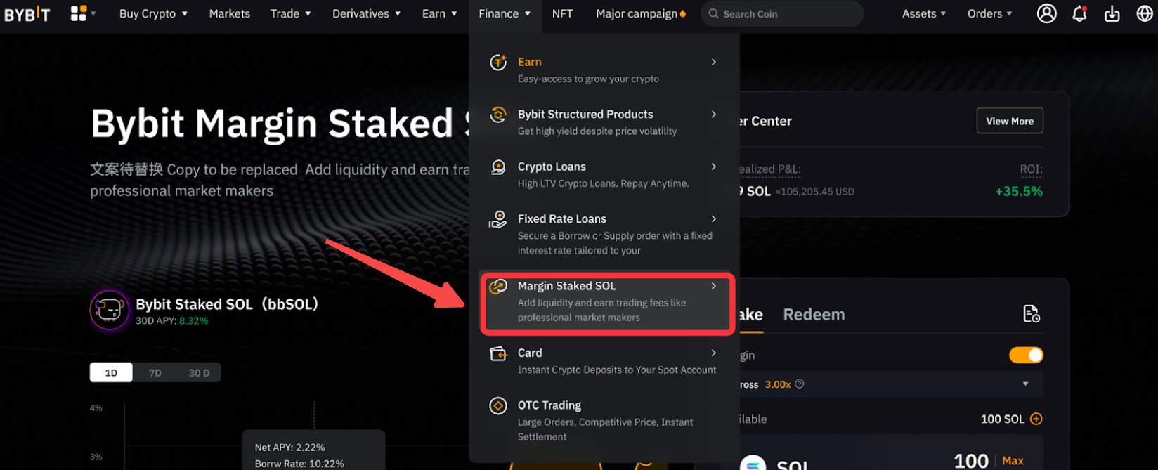 第 1 步:点击页面导航栏中的金融 → 杠杆质押 SOL,进入杠杆质押 SOL 页面。