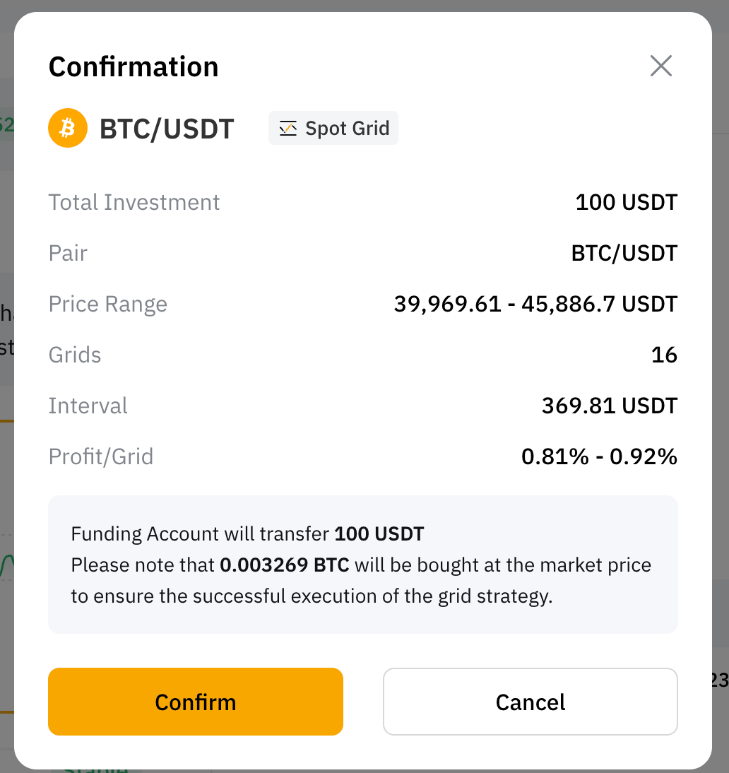 第 4 步:请再次确认您创建的网格机器人信息,然后点击确认开始交易。