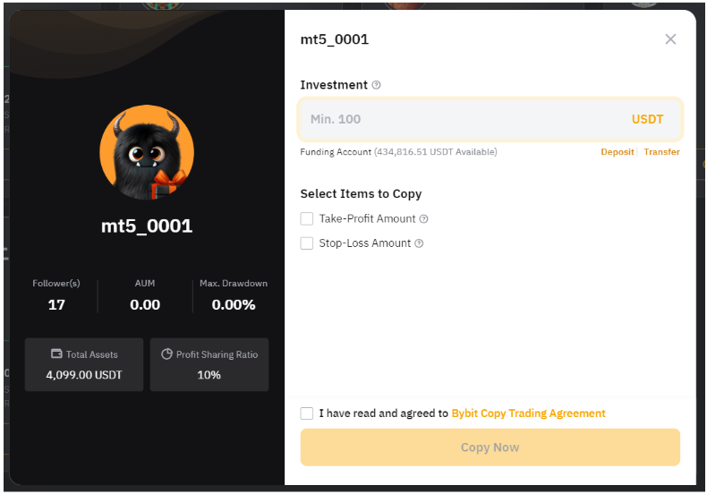 投资额:跟单用户的最低投资额为 100 USDx,最高投资额为 1,000,000 USDx。请注意,您的交易达人可以针对最低跟单金额设置更高的要求,该字段中将显示最低金额。