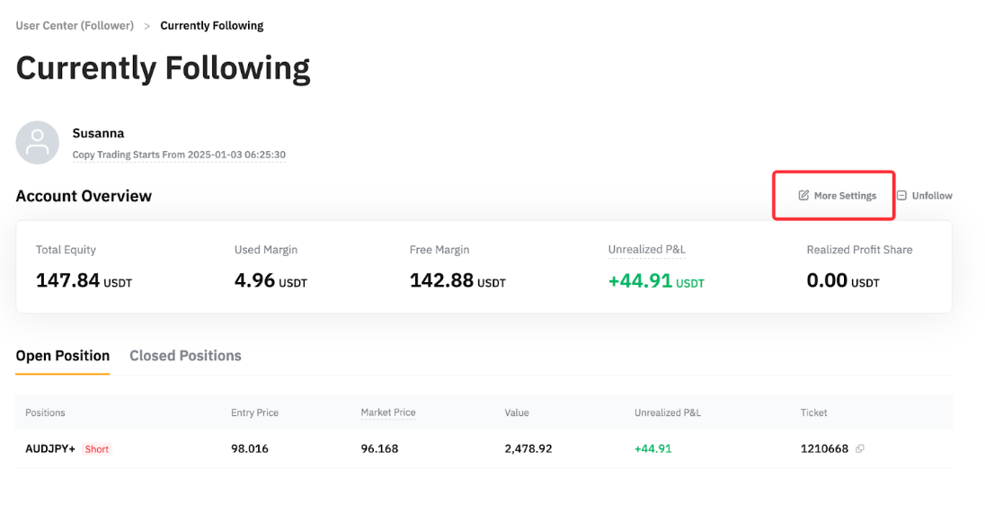 第 3 步:前往当前跟单页面,点击更多设置。您可以更新止盈和止损额,然后点击修改跟单参数。