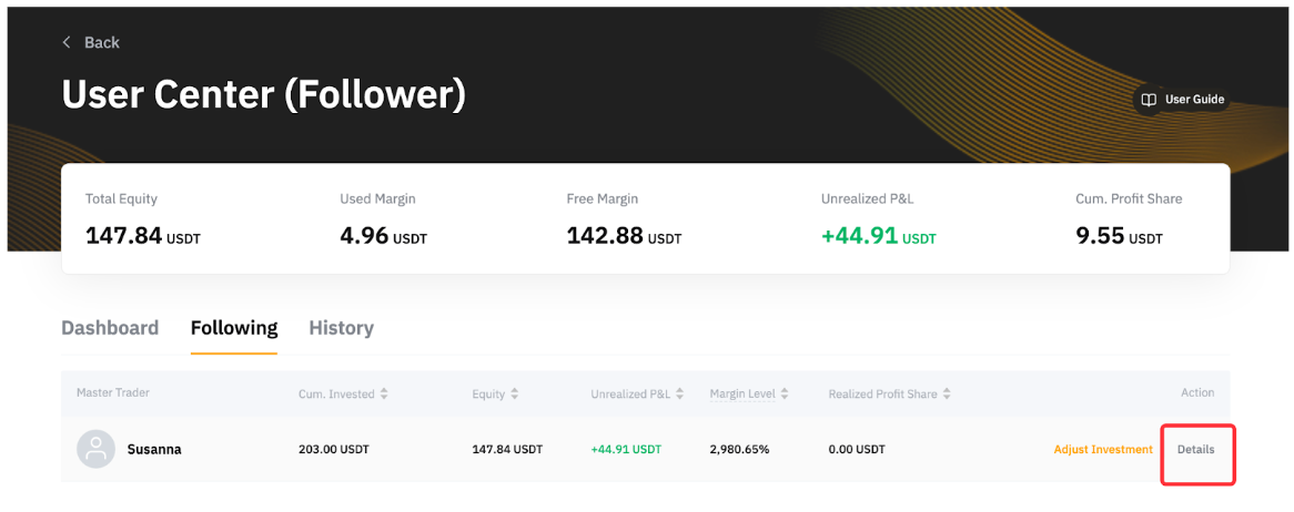 第 2 步:在跟单中选项卡下方,点击您跟随的交易达人的详情。