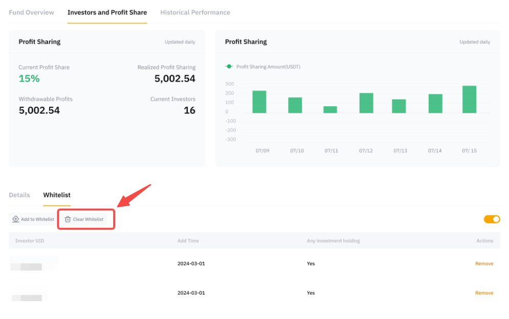 如需一次性移除所有白名单投资者,可点击清空白名单按钮。后续如需再将这些投资者添加至白名单,需重新手动添加。