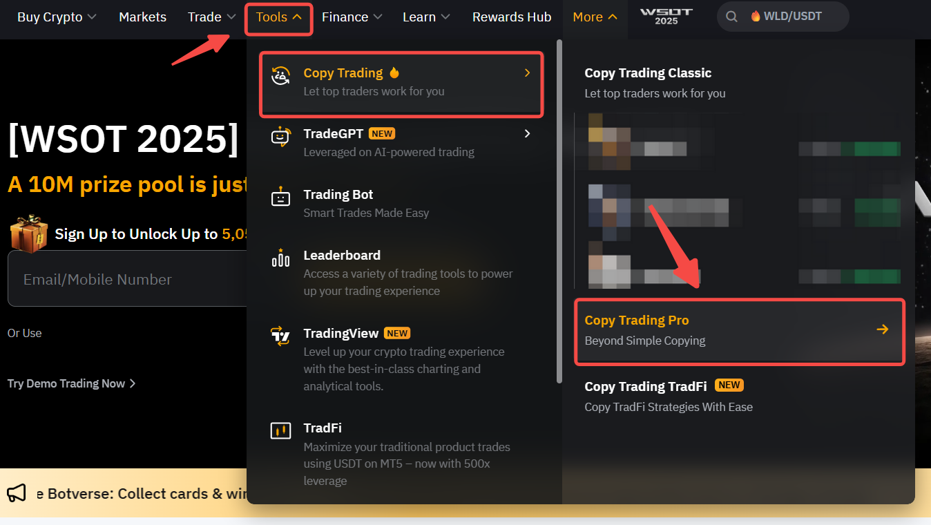 第 1 步:登录 Bybit 网页端,随后在导航栏中点击工具 → 跟单交易 → 跟单交易 Pro。