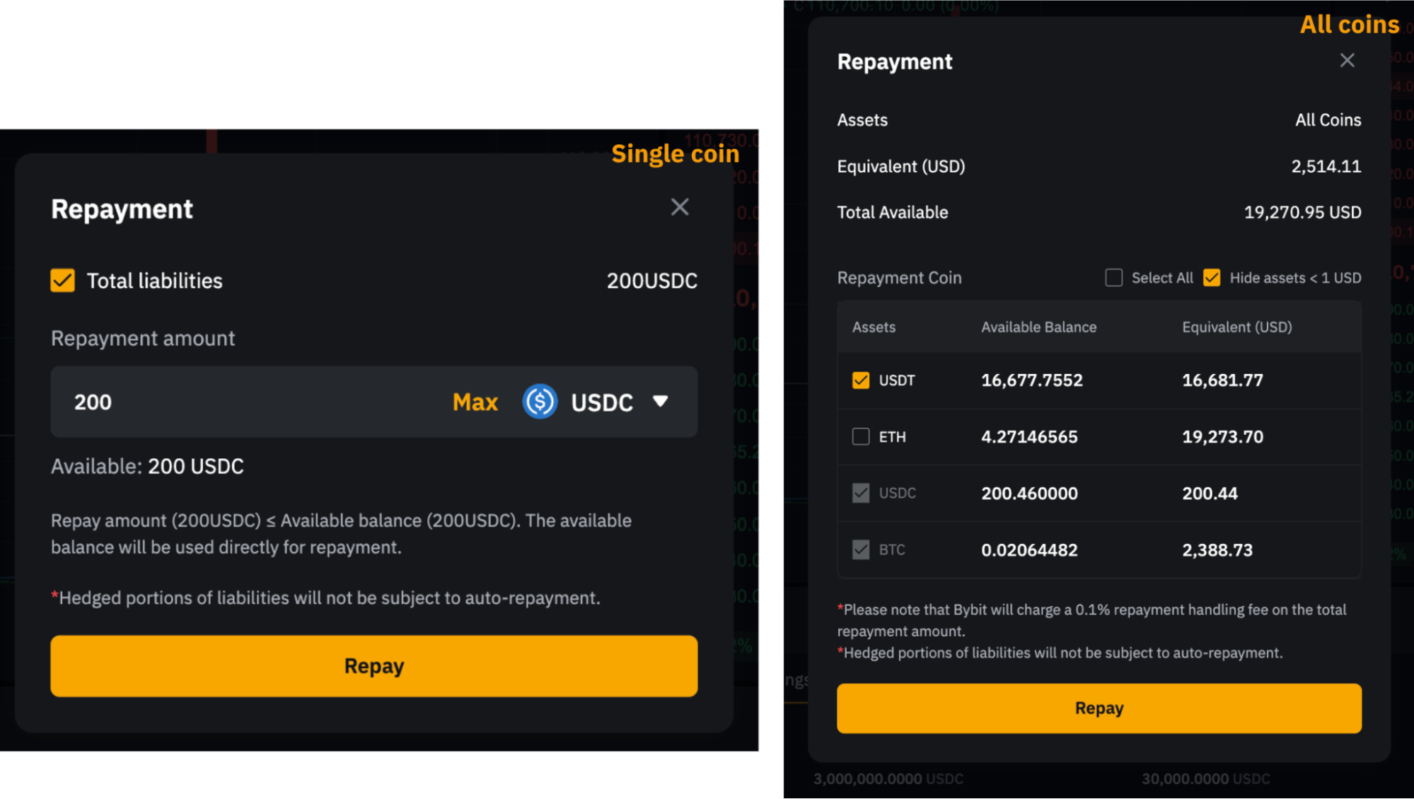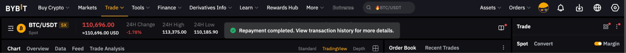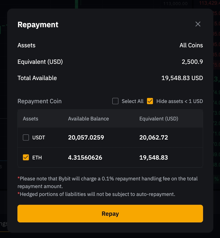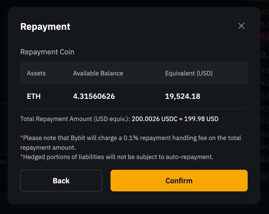 确认后,系统将首先使用您可用的借用货币进行还款。任何剩余负债将通过把抵押资产转换为借入货币来偿还。如果还款需要转换,Bybit 将在还款总额中收取 0.1% 的手续费