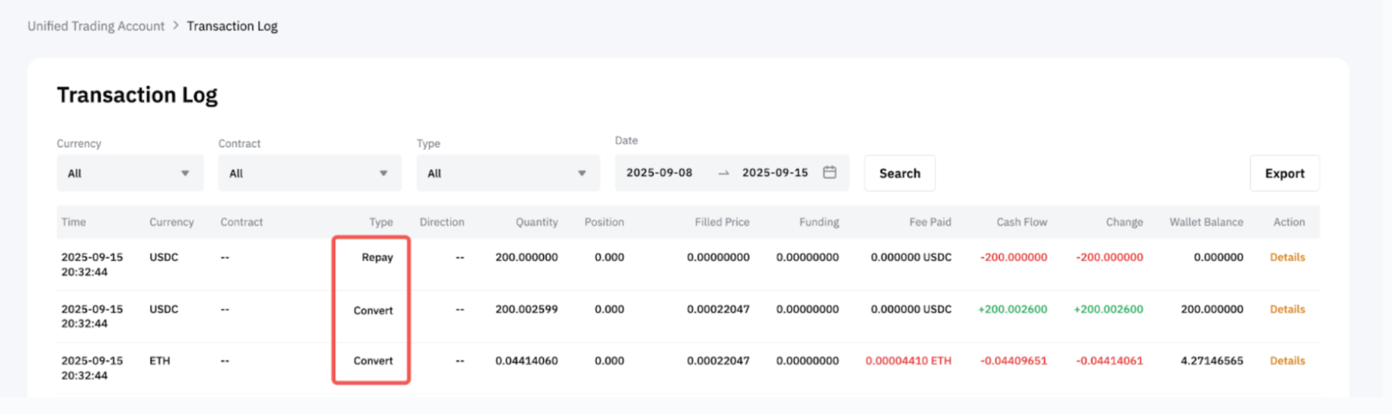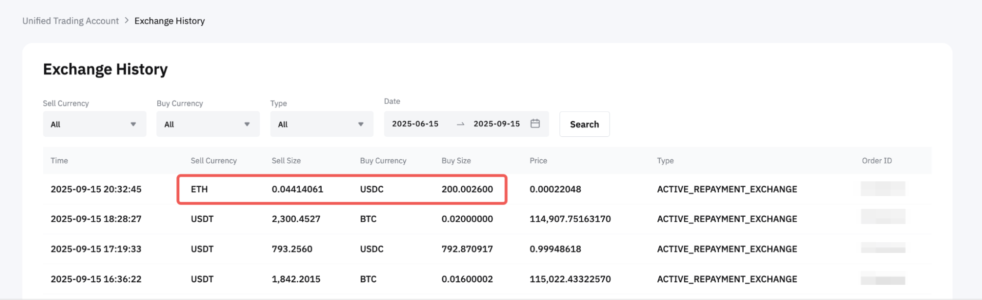 在您的交易日志中,您可以在闪兑还款交易类型下找到每个还款的详细信息,这些交易类型以相同的时间戳和订单 ID 顺序列出。闪兑交易表示所选抵押资产的任何自动转换,以偿还借入金额。只有当您的余额中没有足够的借用货币进行还款,并且需要转换时,才会出现。同时,还款交易显示您为借入的货币支付的金额。