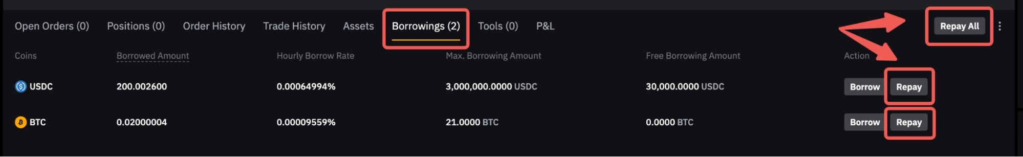 现在支持全额、部分和混合还款(借入货币 + 兑换)。但是请注意,通过资产转移或现货交易(即,将其他保证金资产出售到借入的货币中)完成的任何还款将仅支付您的衍生品借款的未偿还金额。任何现货借款仍将保留,且必须手动支付。