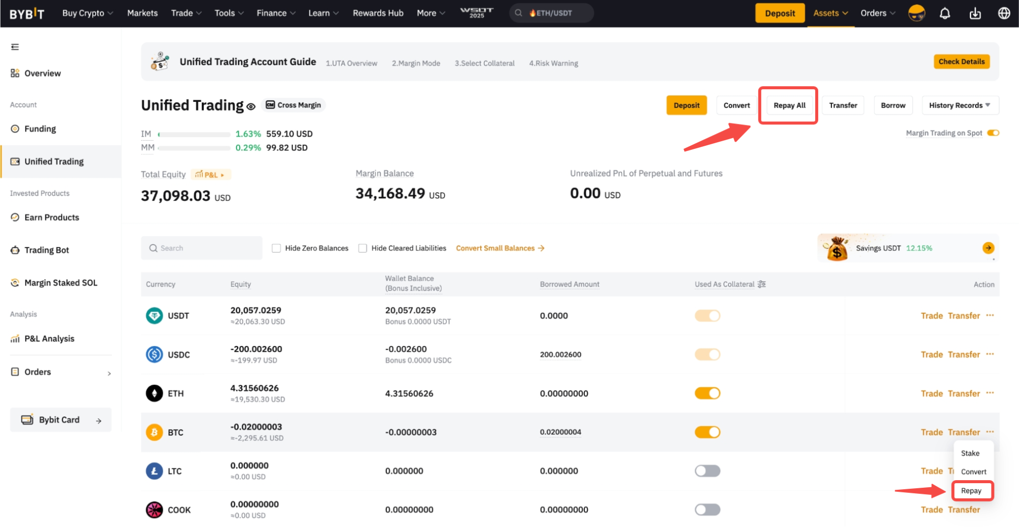 • 要偿还所有借入的货币,请单击统一交易页面顶部的全部还款