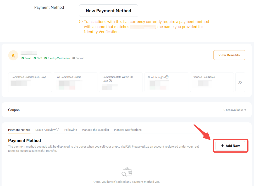 点击 管理付款方式,您将被引导至P2P用户心中,以新增您的付款方式。