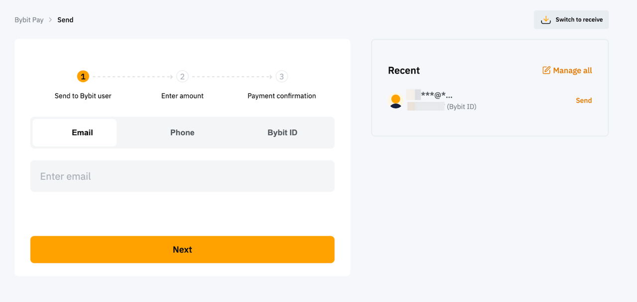 通过 Bybit Pay,您可以与其他 Bybit Pay 用户和商家进行交易。现在支持两种付款方式:使用 App 进行 Bybit Pay 二维码支付,以及使用 App 和网站进行内部转账。