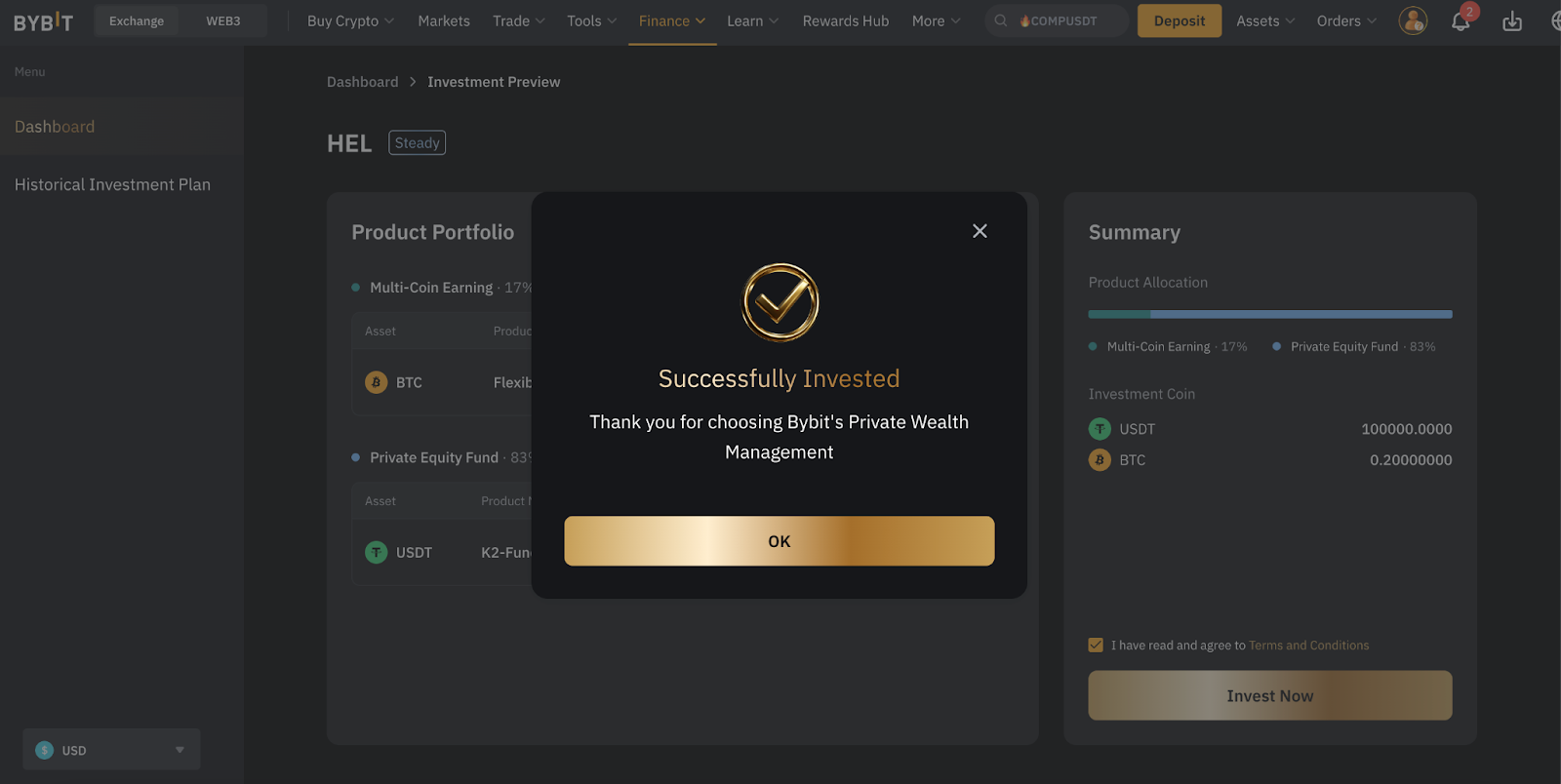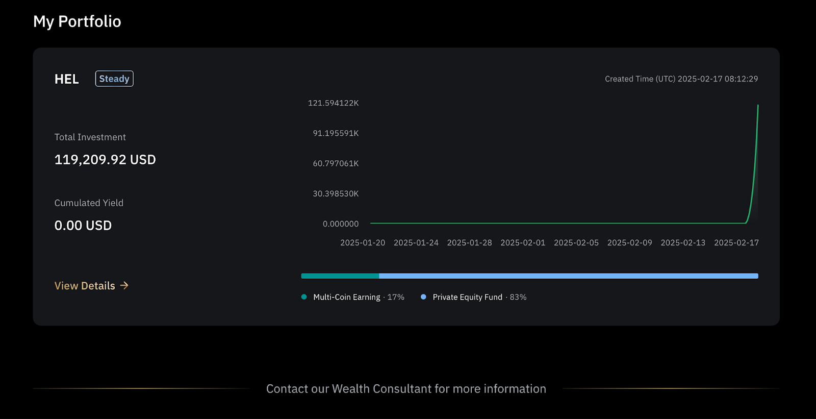 我们的专家会根据您的风险偏好和回报预期,为您配置优质加密货币资产与投资工具。 一经确认,我们的私人财富管理团队将最终敲定您的投资计划,届时您可前往个人 PWM 看板进行查看。