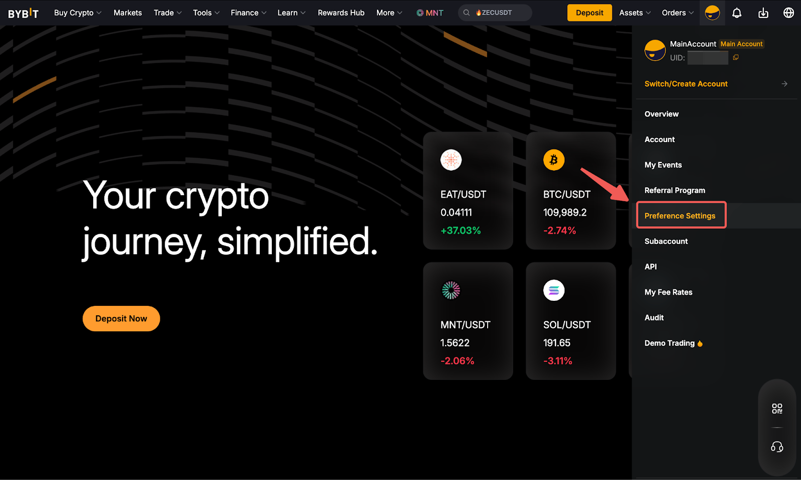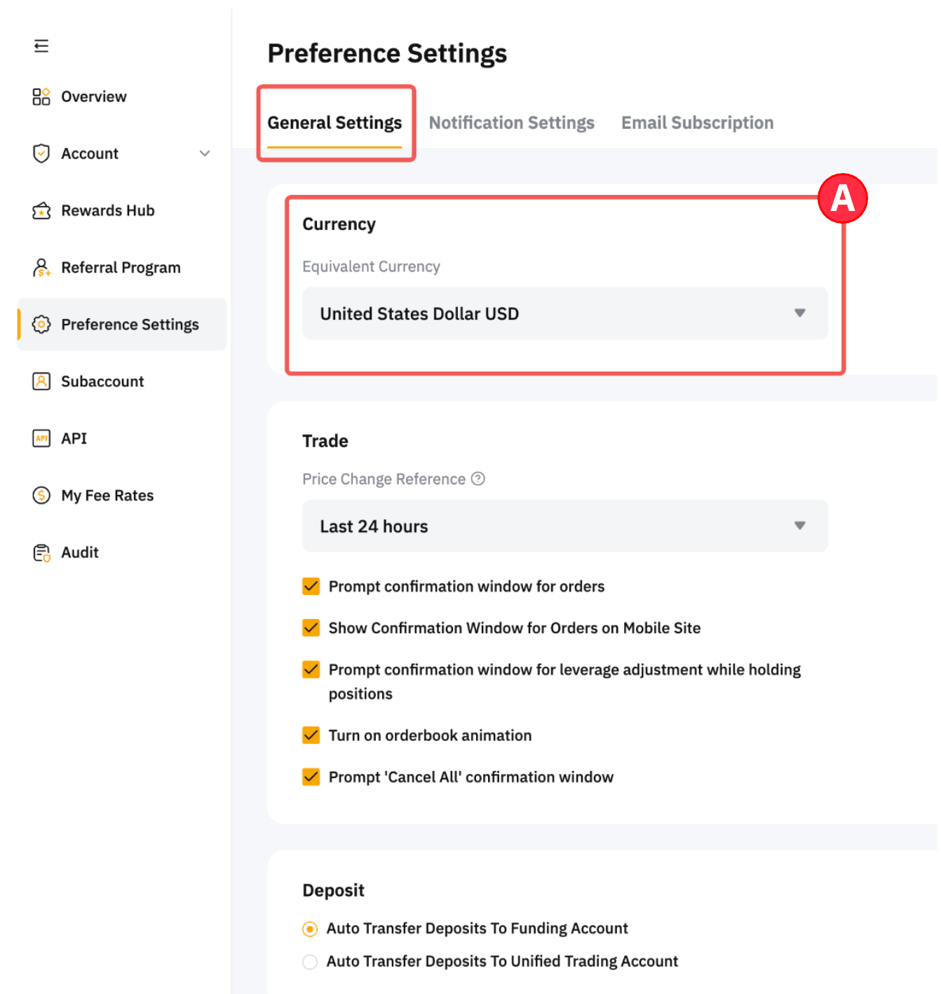 在“通用设置”选项卡中,选择要在 Bybit 网站上显示的首选货币。该货币将用来估算您的资金和订单金额,以更好地了解您账户的价值。