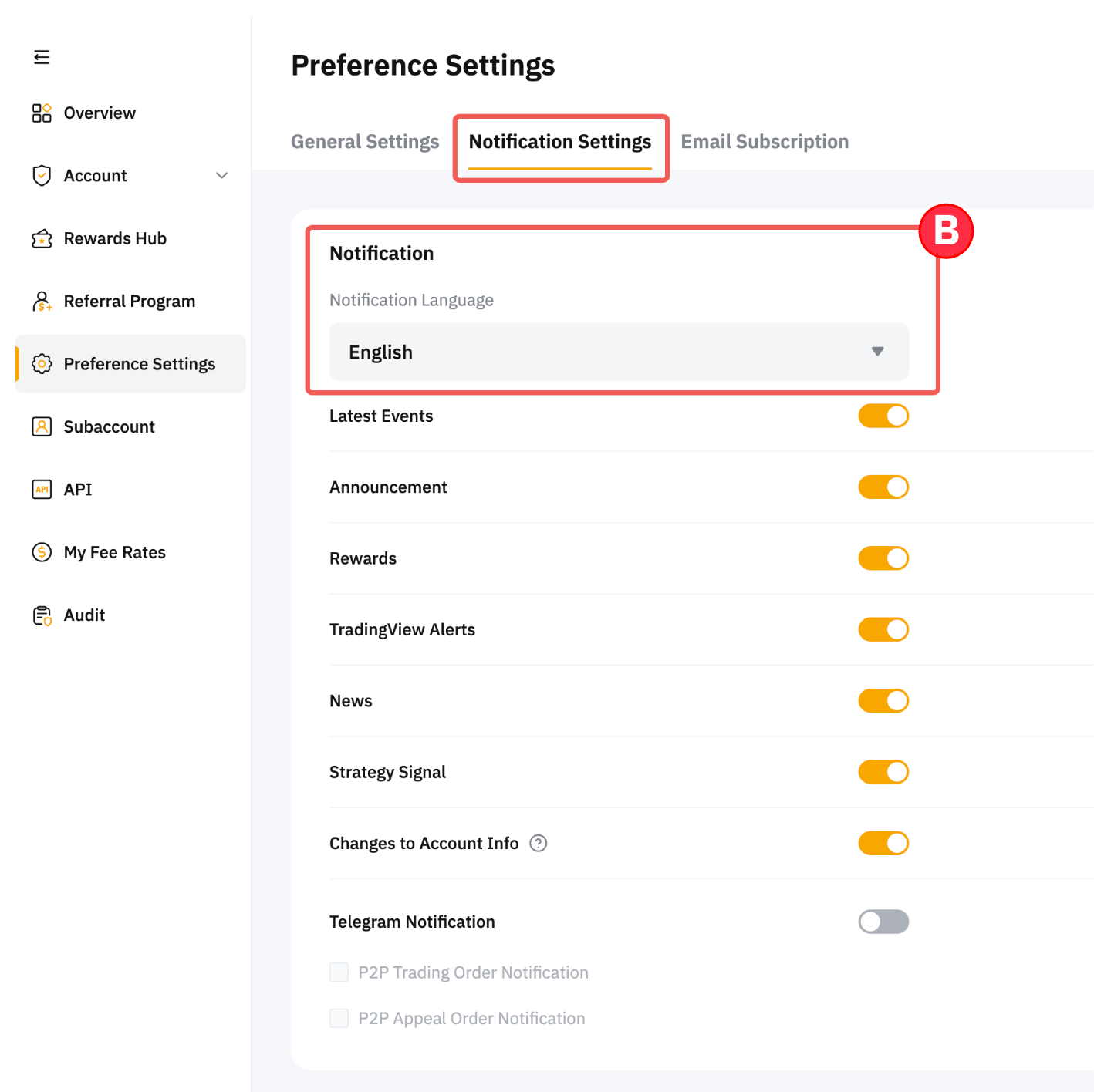在“通知设置”选项卡的下拉菜单中选择您的首选通知语言。请注意,此语言设置仅适用于您收到的电子邮件通知。要修改网站或弹出通知的语言,请参阅本指南