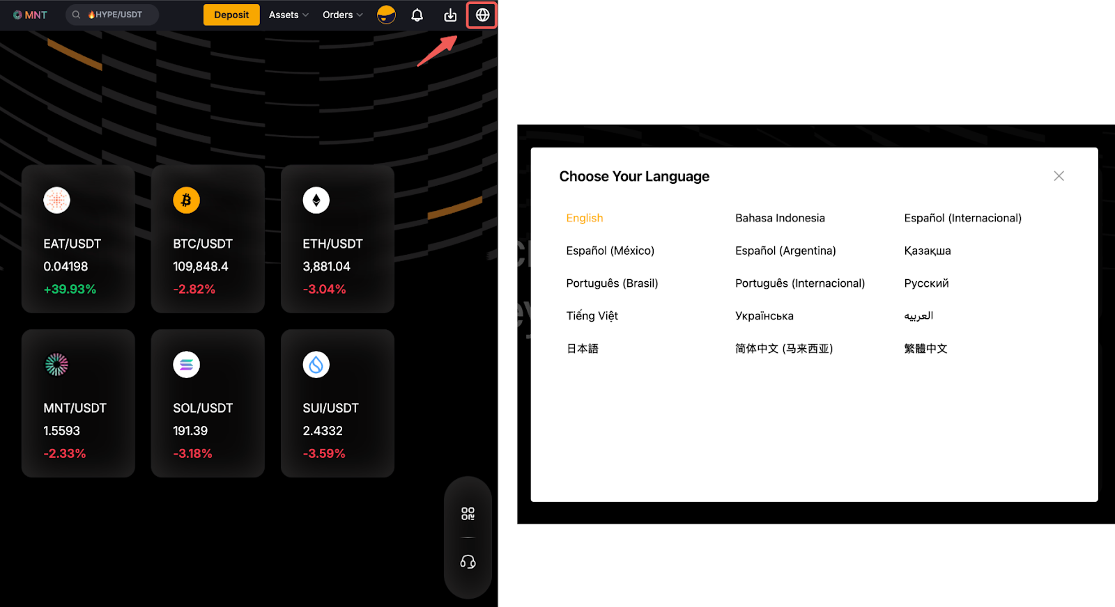 在网站右上角,点击地球图标,打开可用语言列表并选择您的首选语言。