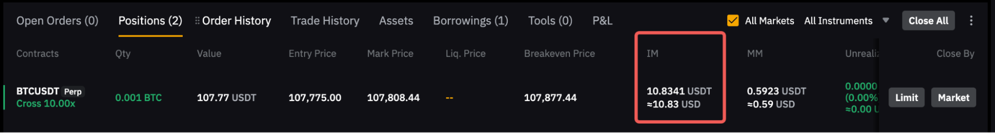请注意,仓位选项卡中显示的起始保证金包括 Taker 费,该费用可能会在平仓时产生。