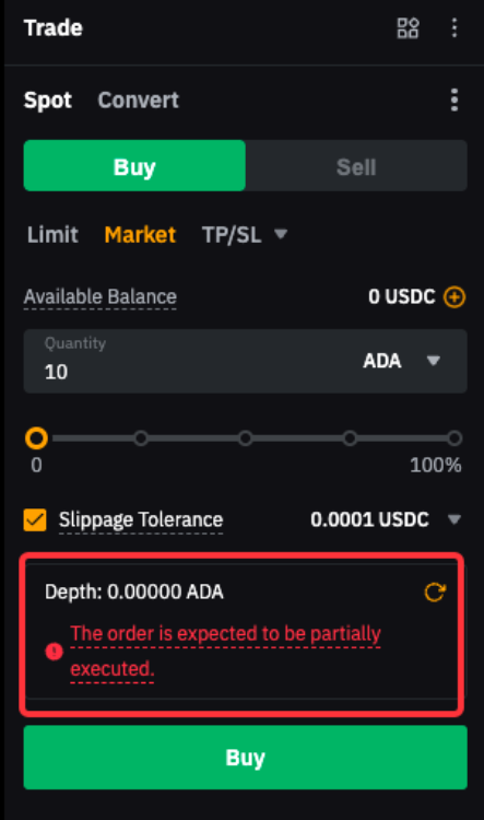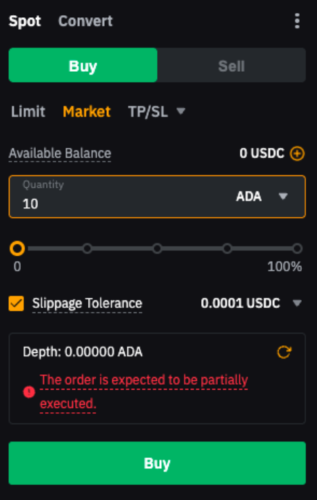 — 实际执行情况视订单规模和市场深度而定,因此无法保证订单全部成交。如果市场深度不足以让您的订单全部成交,则滑点容差范围内的部分将被执行,而滑点容差范围外的部分将被取消。