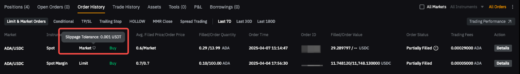 前往交易页面,选择底部的订单历史。将鼠标悬停在订单上,即可查看其滑点容差。