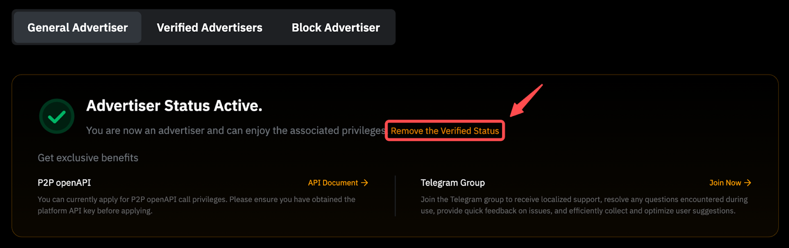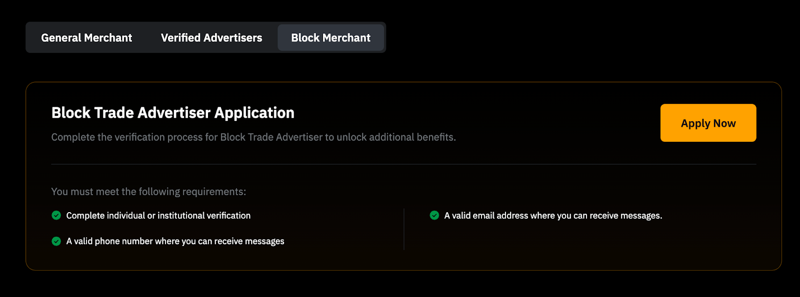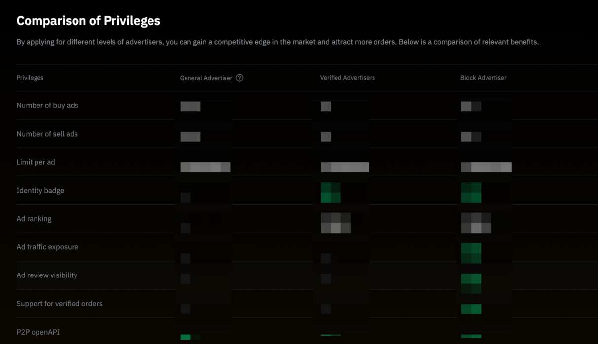 要成为认证广告方或大宗广告方,您可以前往 P2P 广告方申请 页面查看相应的要求并申请成为认证或大宗广告方。