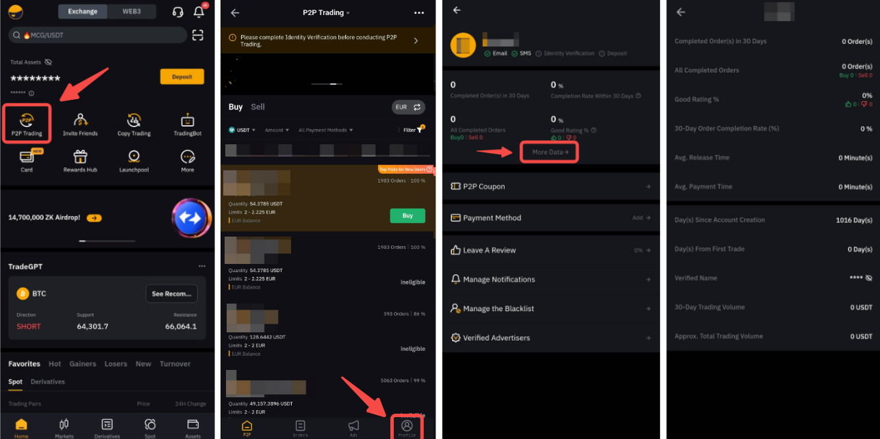 如果您使用 App,请前往 P2P 页面,点击个人资料图标打开 P2P 用户中心。点击更多数据,显示您的 P2P 交易信息。