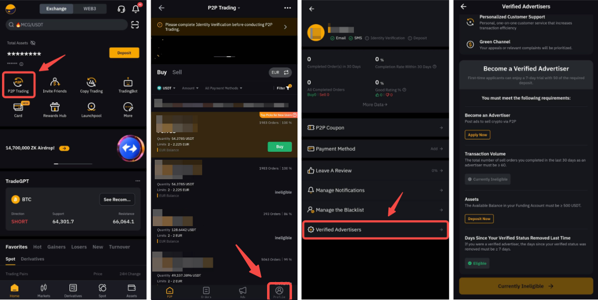 要查看您是否符合普通广告商的其中一个等级,请点击 P2P 用户中心,然后点击网站上的 2 个右箭头图标,查询您的 P2P 交易账户数据。