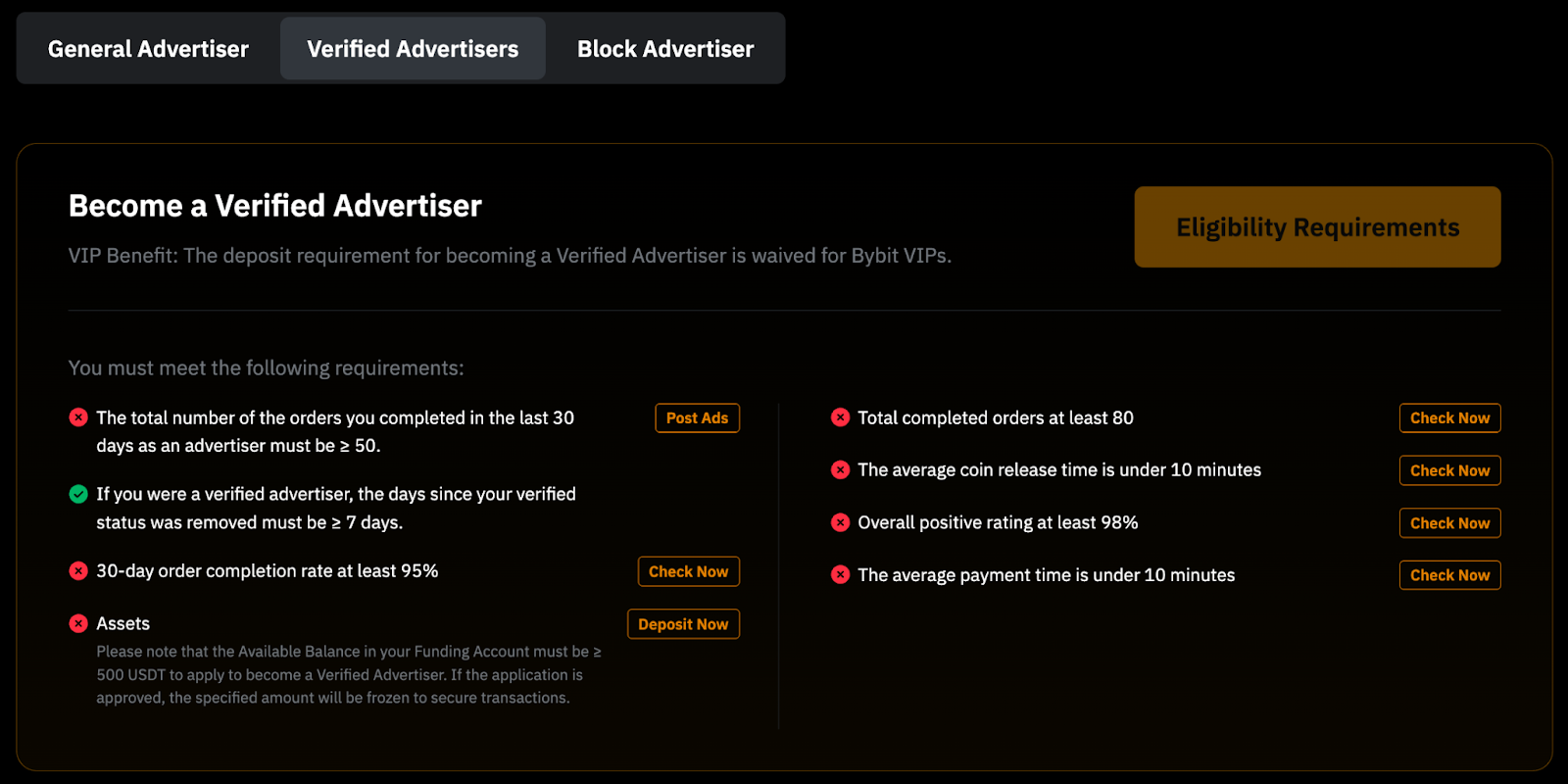普通广告商是指可在 Bybit 上发布 P2P 广告的交易者。共有 3 种不同的广告方级别:新手、常规和高级,均可获得不同级别的福利。根据累计交易对手数量和您账户上最近 30 天的 P2P 交易量,相关级别将应用于您的账户。 |