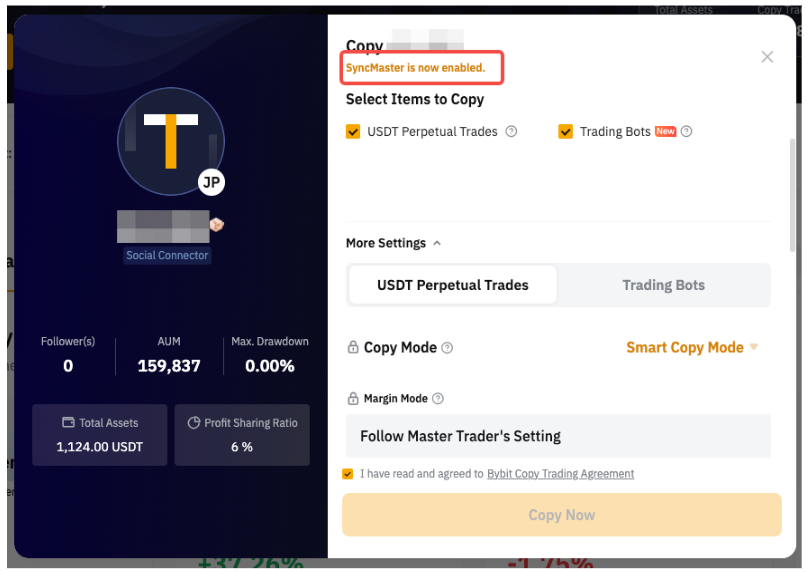 跟單本金:最低跟單本金為 50 USDT。請注意,交易達人可調高最低跟單金額,該欄中將顯示調好的金額。